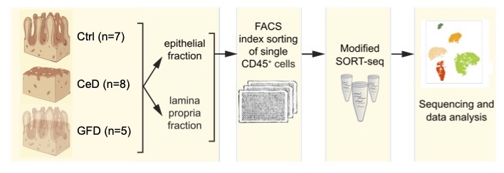 Celiac disease is an autoimmune disorder in which ingestion of dietary gluten triggers an immune reaction in the small intestine leading to destruction of the lining epithelium. Current treatment focusses on lifelong adherence to a gluten-free diet. Gluten-specific CD4+ T cells and cytotoxic intraepithelial CD8+ T cells have been proposed to be central in disease pathogenesis. Here we use unbiased single-cell RNA-sequencing and explore the heterogeneity of CD45+ immune cells in the human small intestine. We show altered myeloid cell transcriptomes present in active celiac lesions. CD4+ and CD8+ T cells transcriptomes show extensive changes and we define a natural intraepithelial lymphocyte population that is reduced in celiac disease. We show that the immune landscape in Celiac patients on a gluten-free diet is only partially restored compared to control samples. Altogether, we provide a single cell transcriptomic resource that can inform the immune landscape of the small intestine during Celiac disease.
