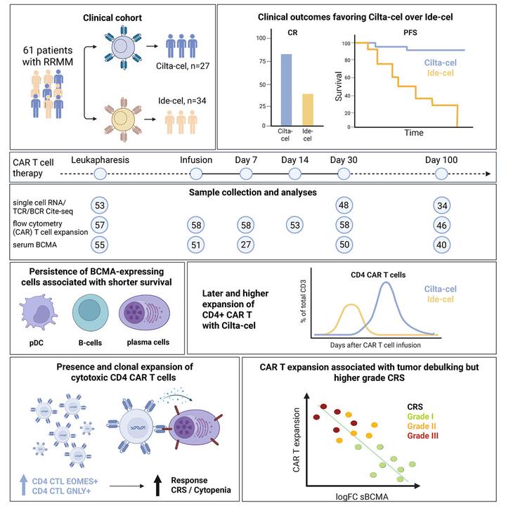 This study presents a longitudinal single-cell multi-omics atlas of immune dynamics in multiple myeloma patients treated with BCMA-directed CAR T cells. Using data from 61 patients, it identifies immunological biomarkers linked to treatment efficacy and toxicity, providing insights into CAR-T expansion, B-cell recovery, tumor burden, and cytokine release syndrome. The atlas highlights CD4+CAR+ T cells as critical for durable response and reveals differential gene programs in responders versus non-responders, advancing personalized immunotherapy.